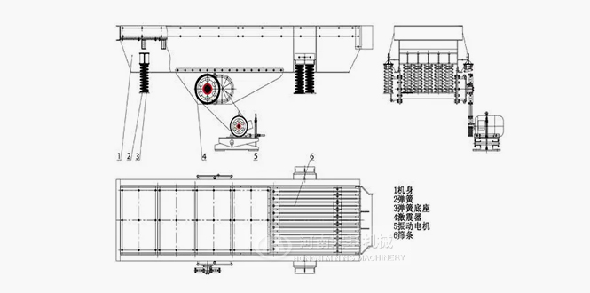 振動(dòng)給料機(jī)是利用振動(dòng)器中的偏心塊旋轉(zhuǎn)產(chǎn)生離心力,使篩廂、振動(dòng)器等可動(dòng)部分作強(qiáng)制的連續(xù)的圓或近似圓的運(yùn)動(dòng)。振動(dòng)給料機(jī)是由給料槽體、激振器、彈簧支座、傳動(dòng)裝置等組成。槽體振動(dòng)給料的振動(dòng)源是激振器,激振器是由兩根偏心軸(主、被動(dòng))和齒輪副組成,由電動(dòng)機(jī)通過(guò)三角帶驅(qū)動(dòng)主動(dòng)軸,再由主動(dòng)軸上齒輪嚙合被動(dòng)軸轉(zhuǎn)動(dòng),主、被動(dòng)軸同時(shí)反向旋轉(zhuǎn),使槽體振動(dòng),使物料連續(xù)不斷流動(dòng),達(dá)到輸送物料的目的。