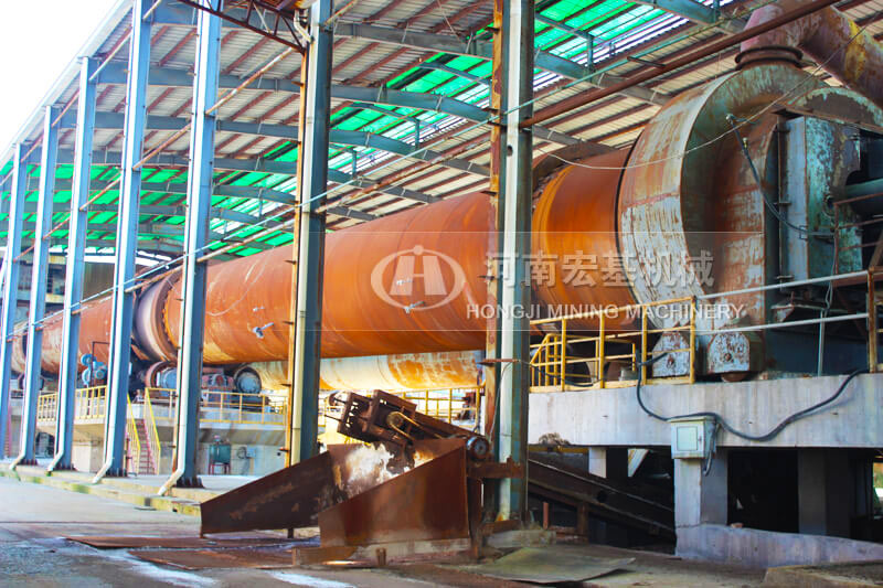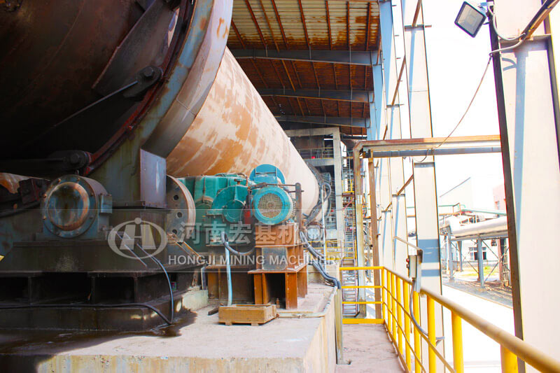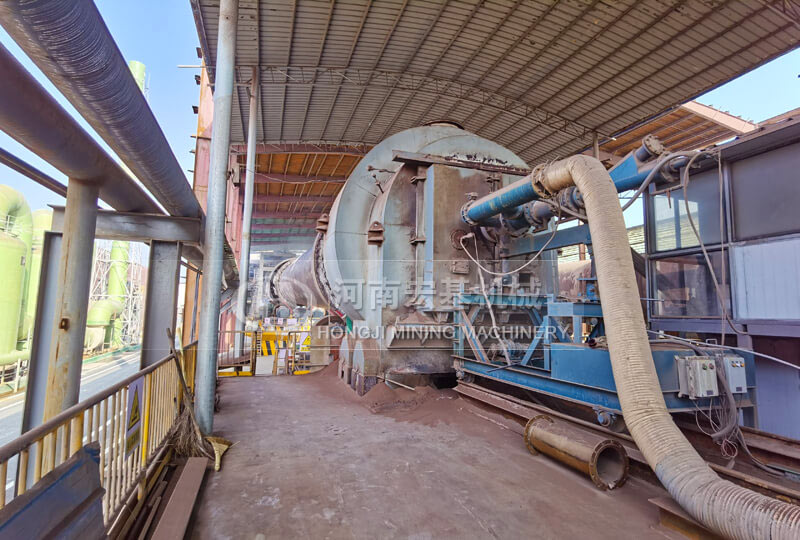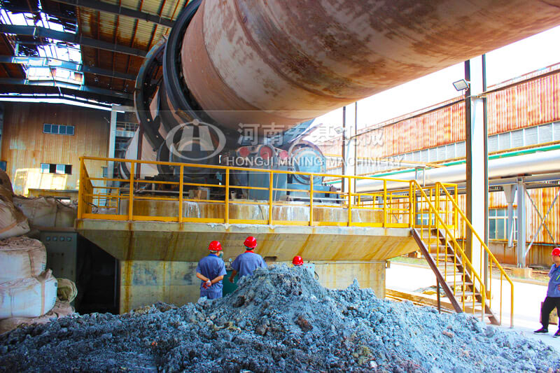 窯的出料口安裝一臺(tái)濕式球磨機(jī),高溫的物料進(jìn)入到球磨機(jī),同時(shí)向入磨溜子加入水分,物料在磨機(jī)內(nèi)部的高溫環(huán)境下,被磨成料漿,發(fā)生浸出反應(yīng),然后排出磨機(jī),進(jìn)入下一流程。磨內(nèi)水分蒸發(fā)產(chǎn)生的蒸汽,被窯頭的負(fù)壓抽吸到窯內(nèi)。